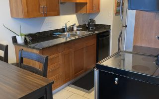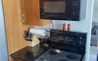 Top floor suite features 2 bedrooms, nicely updated 4 piece bathroom, newly renovated full kitchen with newer cupboards, granite countertops, dishwasher and above the range microwave, balcony, wall air conditioning unit, In-suite laundry/storage, and 1 above ground parking stall included. Large windows offer ample natural light.